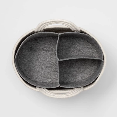 A functional piece that coordinates with nursery decor, the Coiled Rope Diaper Caddy with Dividers from cloud island™ brings easy organization to your space. Featuring an open-top design for easy access to the caddy’s contents, this diaper caddy comes with a removable inner section with three compartments to stash their diapers, wipes, powder, rash creams or other necessities close at hand. Plus, the two side tote handles make it easy to carry from one room to another. Featuring a coil construction in a cream hue, it will bring a touch of texture and style to your changing station.