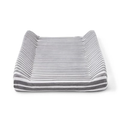 • Skirt and changing pad cover feature gray and white geometric patterns