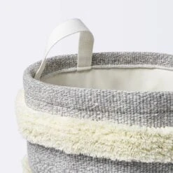 Help keep your kid’s items organized with this Medium Gray/Cream Tufted Canvas Round Storage Bin from Cloud Island™. This round storage bin brings sweet style to your child’s playroom or baby’s nursery. It features a gray canvas construction that’s decorated with cream, tufted stripes for a fun, fluffy texture. This practical medium-sized bin is designed with two attached handles for easy portability, and it can be placed anywhere around the room to keep their toys, books, stuffed animals, bath items and other essentials organized.