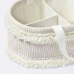 Make use of this Tufted-Fabric Diaper Caddy Storage Basket from cloud island™ to organize your baby’s supplies. The exterior of this oval diaper caddy has a woven design in khaki and white with tufted accents on the top and base, paired with a cream-colored interior for an elegant look. The three divided compartments come in handy for stashing their diapers, wipes, rash creams and other necessities, while the top handles allow for easy portability.